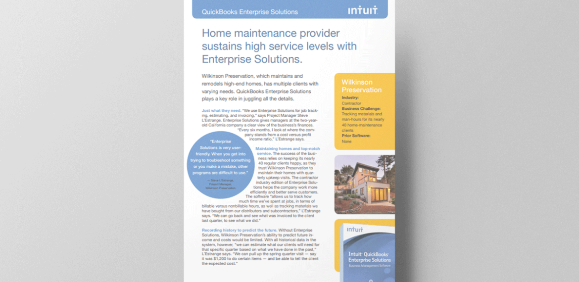 Wilkinson Preservation, which maintains and remodels high-end homes, has multiple clients with varying needs. QuickBooks Enterprise Solutions plays a key role in juggling all the details.